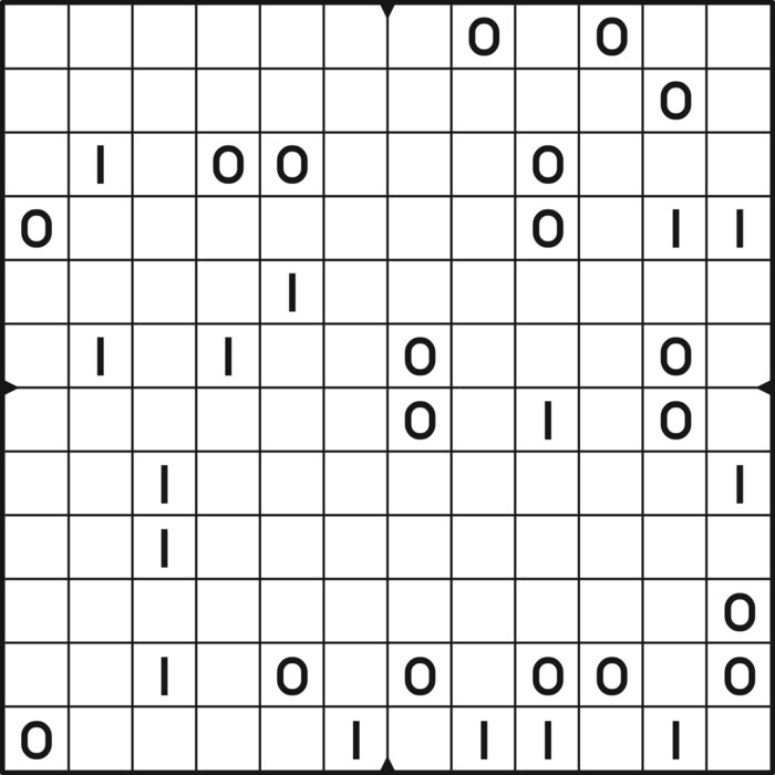 Every Sunday solve a special edition binairo. Remember: Solve each puzzle with only 0's and 1's and no more than two the same numbers may be placed directly next to or below each other. Every row and every column must contain as many zeroes as ones. The combination of zeroes and ones in every row must be unique, as does the combination in each column.