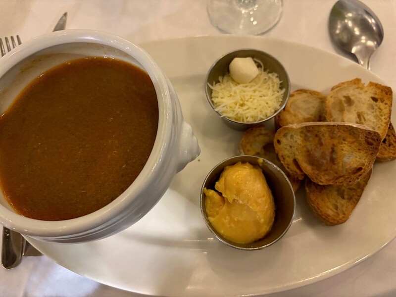 The bouillabaisse that followed did not disappoint. Served in two courses, as it should be, first the unctuous, saffron-infused fish broth, or soup, topped with a garlic crouton slathered with spicy rouille, a red pepper spread, followed by fish and shellfish, more broth, croutons and rouille. I loved eating it seaside, watching the stars emerge over the port.